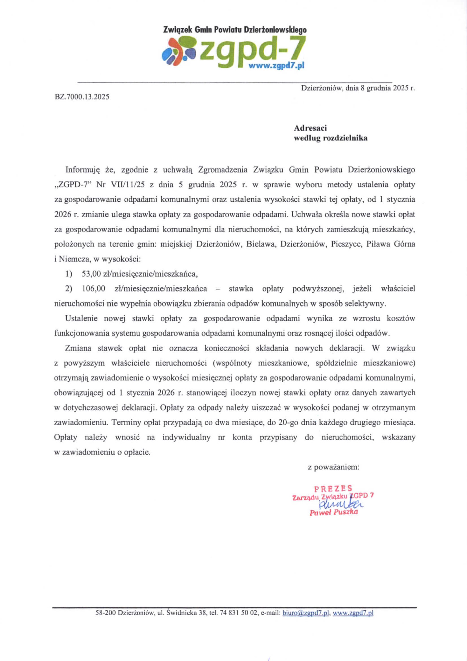 Informuję że, zgodnie z uchwałą Zgromadzenia Związku Gmin Powiatu Dzierżoniowskiego ,,ZGPD-7" Nr VII/11/25 z dnia 5 grudnia 2025 r. w sprawie wyboru metody ustalenia opłaty za gospodarowanie odpadami komunalnymi oraz ustalenia wysokości stawki tej opłaty, od 1 stycznia 2026 r. zmianie ulega stawka opłaty za gospodarowanie odpadami. Uchwała określa nowe stawki opłat za gospodarowanie odpadami komunalnymi dla nieruchomości, na których zamieszkują mieszkańcy, położonych na terenie gmin: miejskiej Dzierżoniów, Bielawa, Dzierżoniów, Pieszyce, Piława Górna i Niemcza